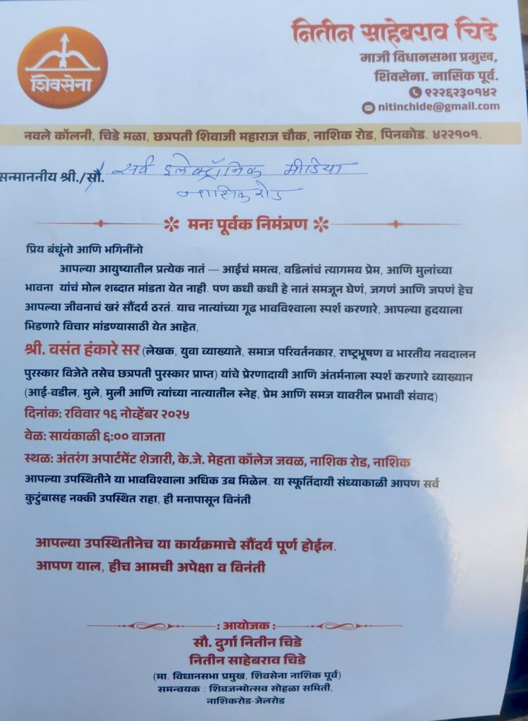 आई-वडील, मुले, मुली आणि त्यांच्या नात्यातील स्नेह, प्रेम आणि समज यावरील प्रभावी संवाद रविवार १६ नोव्हेंबर रोजी सायंकाळी ६:०० वाजता अंतरंग अपार्टमेंट शेजारी, के. जे. मेहता कॉलेज जवळ, नाशिक रोड, नाशिक याठिकाणी होणार असून आपल्या उपस्थितीने या भावविश्वाला नक्कीच अधिक उब मिळेल. या स्फूर्तिदायी संध्याकाळी आपण सर्व कुटुंबासह नक्की उपस्थित रहावे असे नम्र आवाहन सौ. दुर्गा नितीन चिडे, मा. विधानसभा प्रमुख, शिवसेना नाशिक पूर्व, समन्वयक : शिवजन्मोत्सव सोहळा समिती, नाशिकरोड-जेलरोड, शिवसेना. नासिक पूर्व माजी विधानसभा प्रमुख, नितीन साहेबराव चिडे यांनी केले आहे.