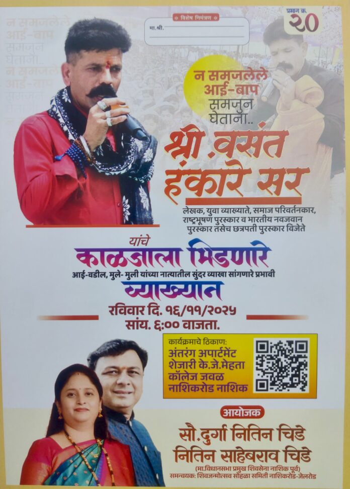 प्रभाग 20 मध्ये रविवारी काळजाला भिडणारे व्याख्यान….. नागरिकांनी उपस्थित रहावे नितीन चिडे यांचे आवाहन…..