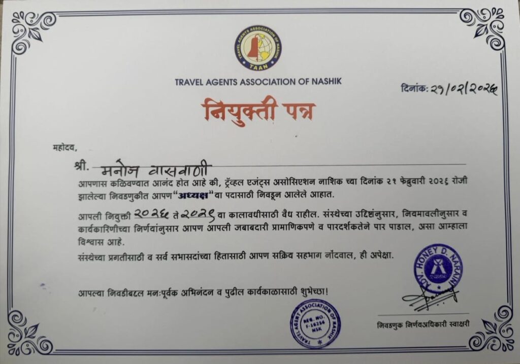 ट्रॅव्हल एजंट असोसिएशन ऑफ नाशिक अध्यक्षपदी मनोज वासवानी यांची निवड झाली आहे. ही निवड २०२६ ते २०२९ या तीन वर्षांसाठी राहणार आहे. त्याचबरोबर उपाध्यक्षपदी परेश अमृतकर, सचिवपदी अंबरीश मोरे, खजिनदारपदी ईशान जोशी, समिती सदस्यपदी विवेक चव्हाण, विश्वनाथ मूर्ती, चंद्रकांत वाणी यांची निवड करण्यात आली आहे.